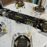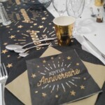 Inspiration pour votre table d’anniversaire sur un thème or et noir! Vous pouvez acheter le chemin de table en 5 mètre, le lot de 10 serviettes et le lot des 10 gobelets.