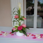 Joli événement sur le thème rose et blanc avec nos chaises et housses, nos assiettes premier prix et nos verres à eau Syrah.