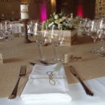 Décoration très élégante avec un nappage blanc et beige sur un thème floral.