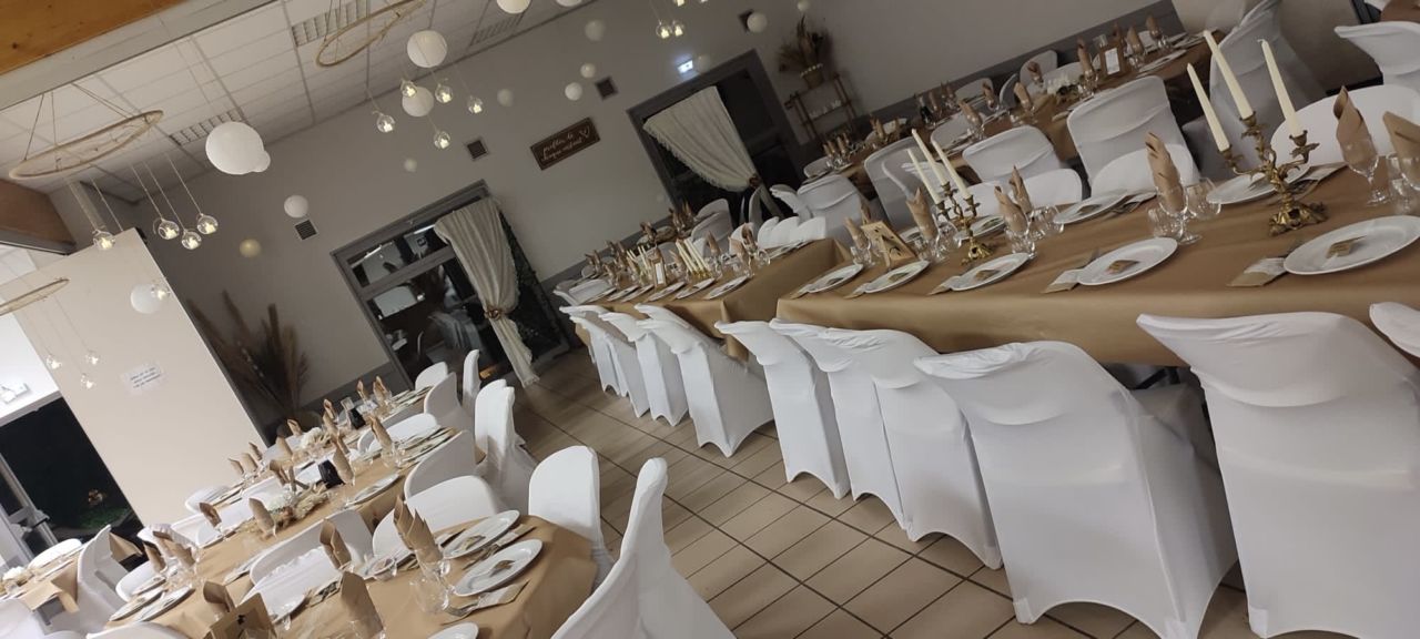 Sur un thème champagne, ces deux clients ont choisi de louer leur vaisselle et le mobilier chez nous. Il s’agit des couverts Aurora, des assiettes blanches premier prix et des verres de la gamme Godello, tout cela reposant sur nos tables rondes! Vous pouvez également retrouver les housses de chaises blanches sur notre site.